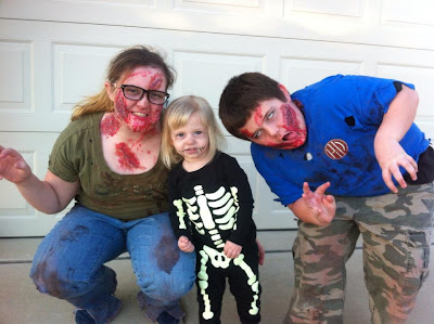 We were mostly zombies last night with a cute little skeleton thrown in to the mix. Total cost of costumes and makeup was $1.99 as both older kids were zombies and picked out old clothes to bloody and rip up. The toddler’s glow in the dark skeleton pjs were a Gymboree thrift store score for $1.99. Makeup was flour, toilet paper and school glue with cocoa powder, acrylic paint, red food coloring, and corn syrup – all on hand.