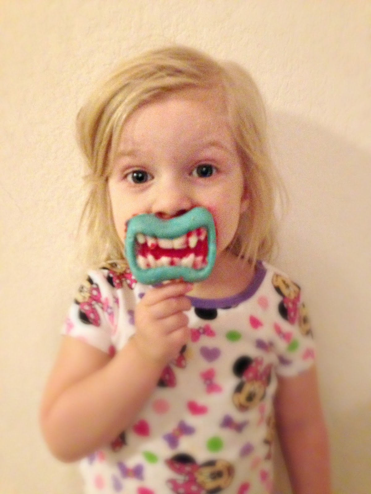 Here is the finished project of the monster teeth. Miss Em wasn’t too happy that the red bled through into the white teeth, but then we decided it gave it a rather creepy “bloody zombie” look. Everyone was up for zombie mouths. This time around I let Miss Em completely do the project. Next time we pull out the monster teeth, I’m going to see if I can thicken up the white so that nothing bleeds through.