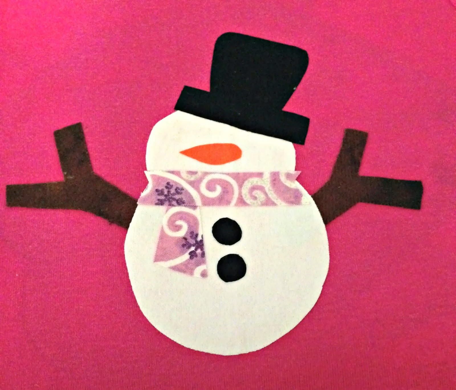 6. You will sew the appliques in a series of what will be covered by another zigzag stitch. For example, on the snowman, you will start first with the arms, then applique the body, then the scarf and carrot nose, and finally the buttons and hat. At the end of your very last applique stitch line (this would be on the scarf), do 1 backstitch, no more is necessary.